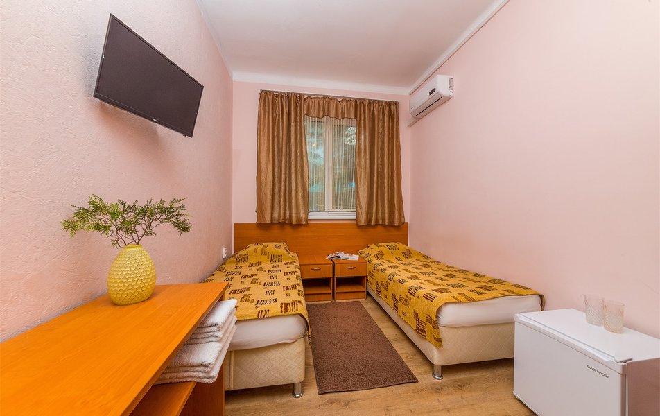 2-местный стандарт (макс. 2 чел., 12 кв. м, телевизор, кондиционер, душ, холодильник, 1-спальные/ 2-спальная кровать, санузел, раздельные кровати возможно сдвинуть и объединить топером ).