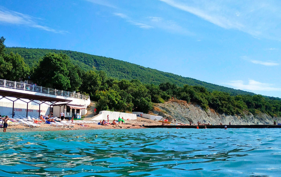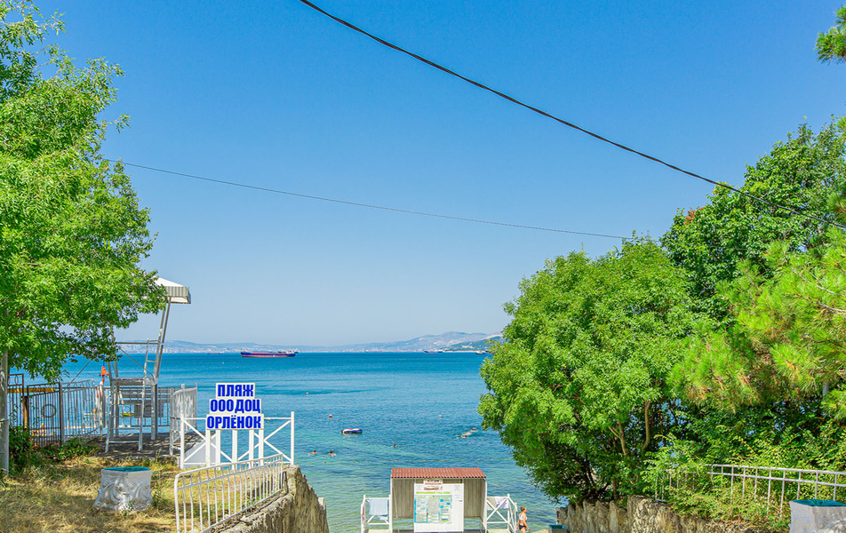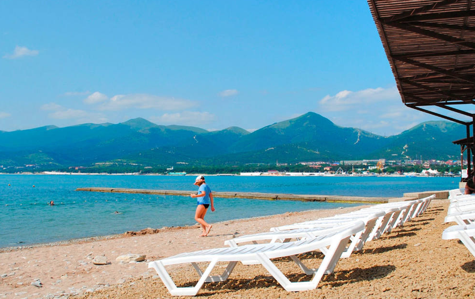 Пляж: собственный, песчано-галечный, оборудованный (лежаки, навесы - бесплатно) , в 100 метрах