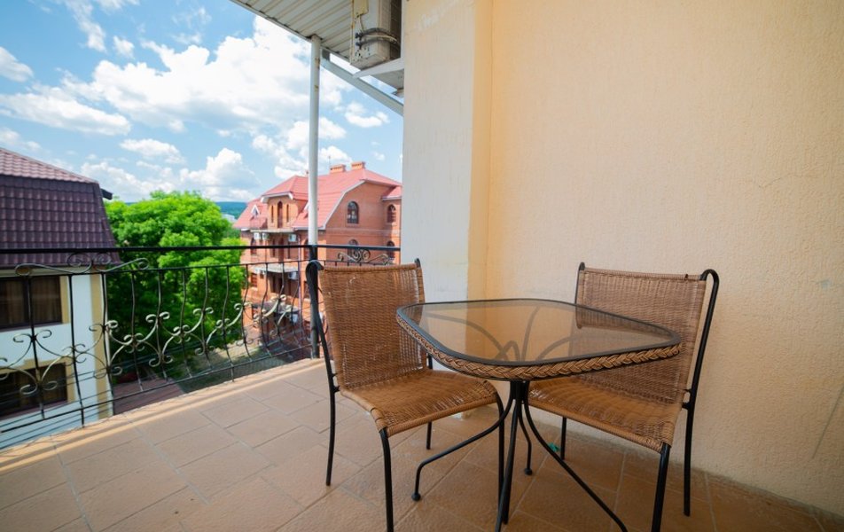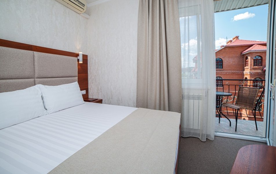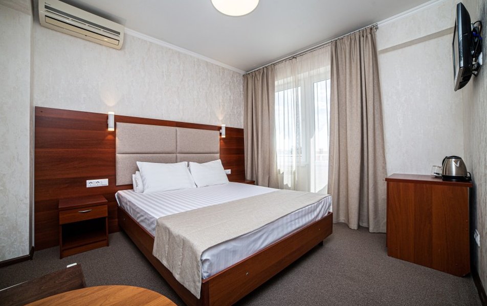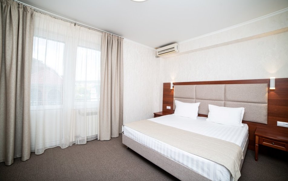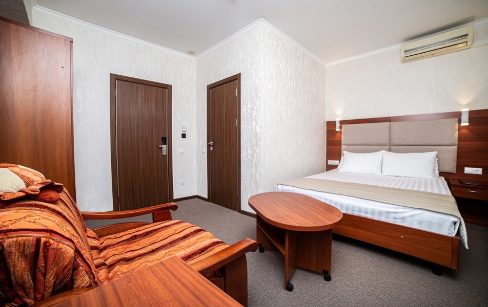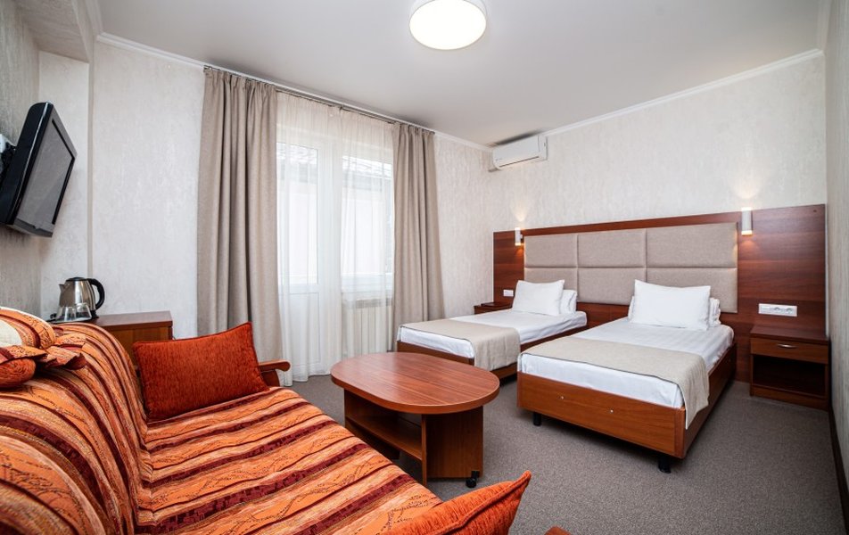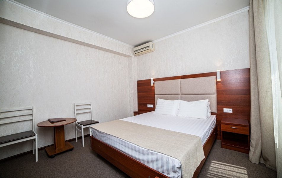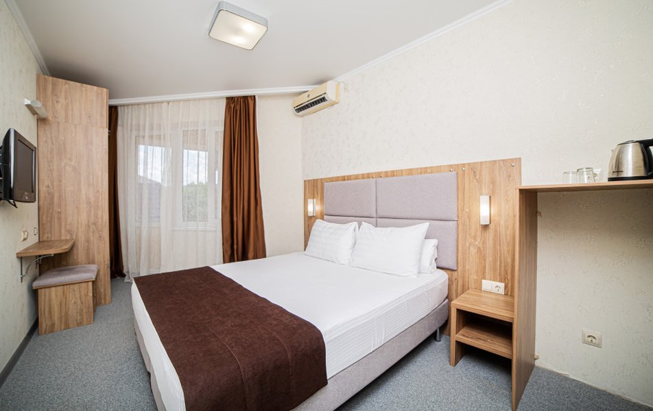 Стандартный 2-местный (1 категория) Количество комнат 1-комнатный Тип номера Стандартный Кол-во основных мест 2 Площадь (кв. м) 20 Балкон с мебелью Мебель: кровать двуспальная, прикроватные тумбочки, стол, стулья, шкаф. Оборудование: мини-холодильник, сплит-система, телевизор ЖК, чайный набор посуды, электрочайник. Санузел с душем, туалетные принадлежности, фен. Стандартный Экстра King 2-местный Площадь (кв. м) 20 Балкон с мебелью. Мебель: вешалка, зеркало, кровать двуспальная, прикроватные тумбочки, столик туалетный, стул, шкаф. Оборудование: мини-холодильник, сплит-система, телевизор ЖК, чайный набор посуды, электрочайник. Санузел с душем, туалетные принадлежности, фен. Стандартный Экстра Twin 2-местный Площадь (кв. м) 20 Балкон с мебелью Мебель: вешалка, зеркало, кровати односпальные, прикроватные тумбочки, столик туалетный, стул, шкаф. Оборудование: минихолодильник, сплит-система, телевизор ЖК, чайный набор посуды, электрочайник. Санузел с душем, туалетные принадлежности, фен.