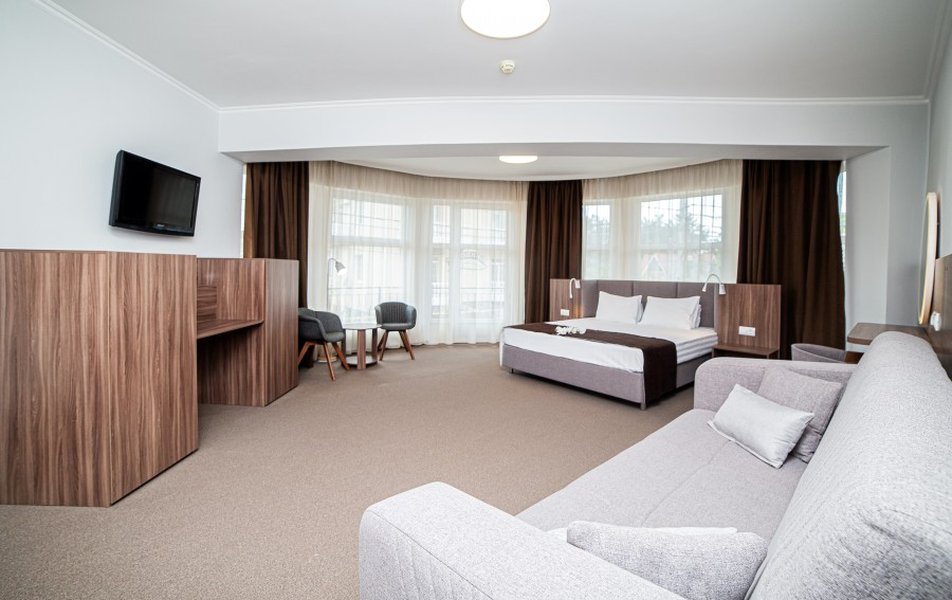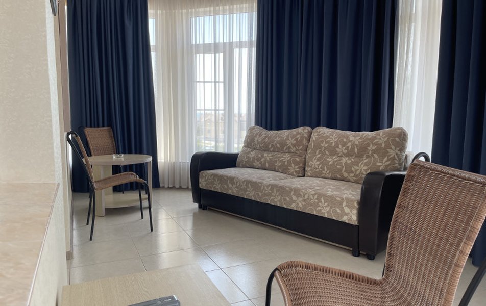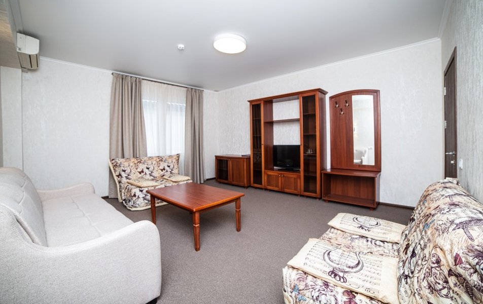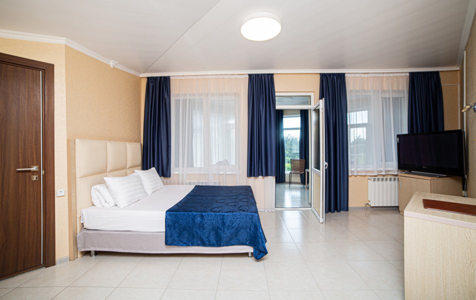 Гранд Резидент 4-местный 2-комнатный Площадь (кв. м) 50 Балкон с мебелью Мебель: вешалка, диван, зеркало, кровать двуспальная, набор мягкой мебели, прикроватные тумбочки, стол, стулья, шкаф. Оборудование: мини-холодильник, сплит-система, телевизор ЖК, чайный набор посуды, электрочайник. Санузел с душем, туалетные принадлежности, фен. Делюкс 4-местный 2-комнатный Площадь (кв. м) 44 Балкон с мебелью Мебель: вешалка диван раскладной зеркало кровати односпальные /одна двуспальная кровать прикроватные тумбочки стол стулья шкаф Оборудование: мини-холодильник, сплит-система, телевизор ЖК, чайный набор посуды, электрочайник. Санузел с душем, туалетные принадлежности, фен.