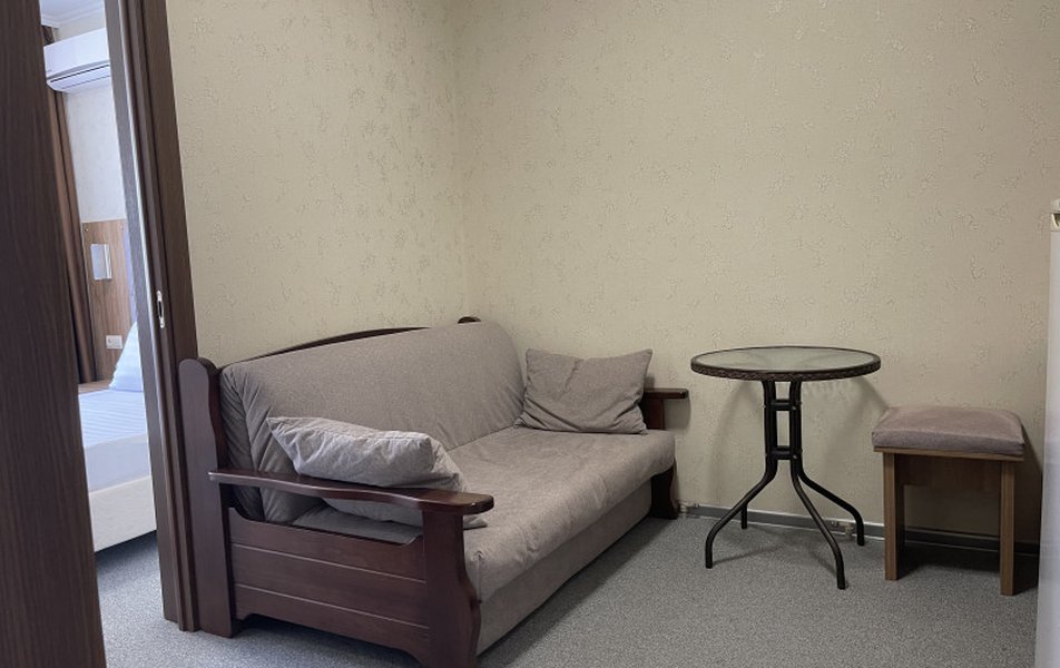 Семейный 5-местный 3-комнатный. Площадь (кв. м) 50 Балкон с мебелью. Мебель: вешалка, диван, зеркало, кровати односпальные, кровать двуспальная, прикроватные тумбочки, стол, стулья, шкаф. Оборудование: мини-холодильник, сплит-система, телевизор ЖК, чайный набор посуды, электрочайник. Санузел с душем, туалетные принадлежности, фен. К услугам отдыхающих: